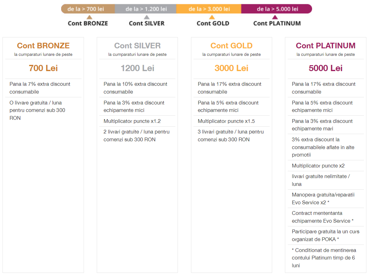 Ca și client POKA, cu un cont activ creat pe site, te poți încadra într-unul din cele cinci niveluri de client, în funcție de istoricul tău de achiziții: