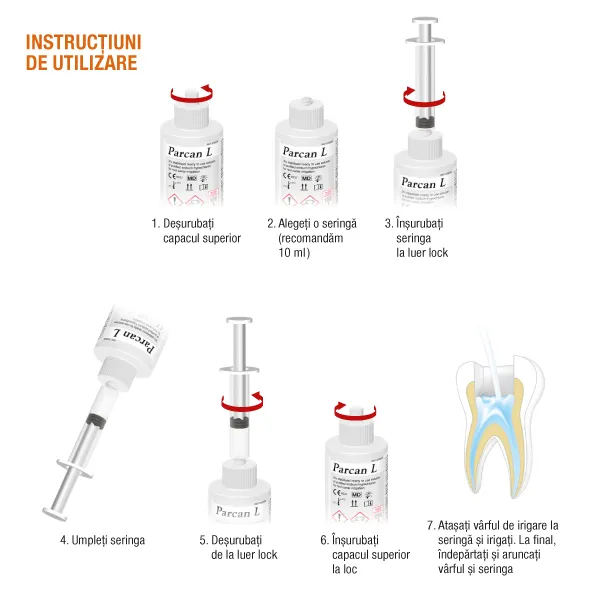 Parcan L - solutie apoasa de hipoclorit de sodiu 3%, gata de utilizare, pentru o irigare eficienta a canalului radicular, cu capac luer-lock.